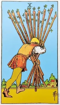 카드의 인물은 10개의 완드를 가득 안고 힘들게 걸어가고 있다. .